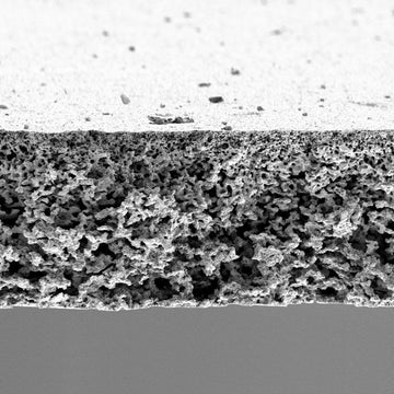 The image shows the membrane cross section under the electron microscope. In reality, the membrane is as thick as a human hair. This picture impressively shows the sieve function of the membrane, because the water has to flow through every single pore!